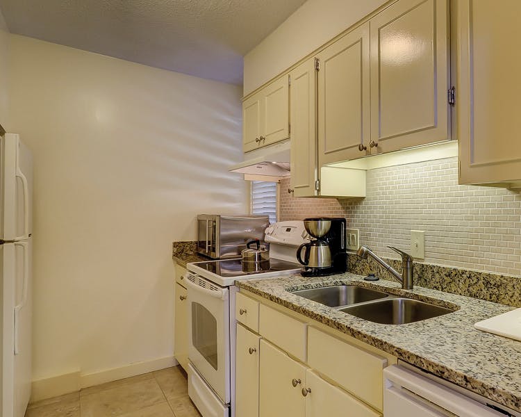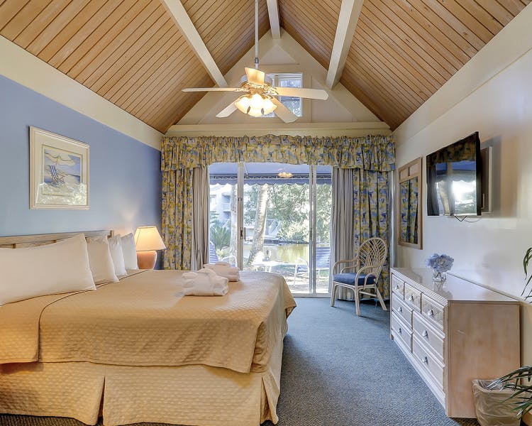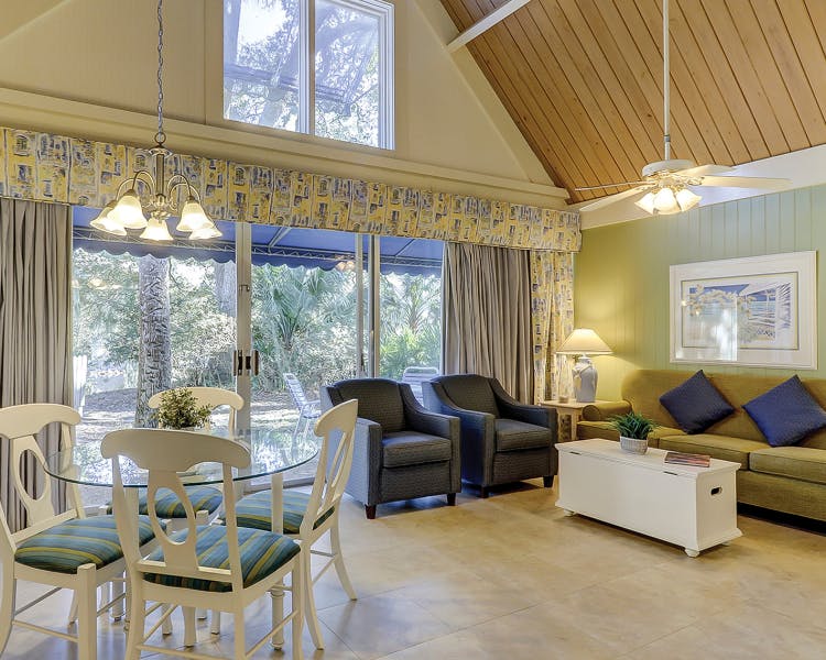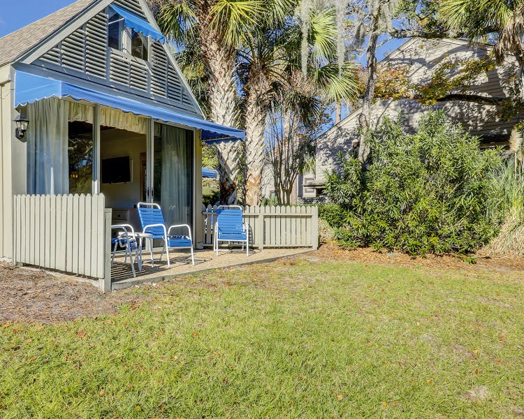 This large cottage style two-bedroom villa has ample living space and allows lots of natural light into the home. As you enter the villa, an entry to a galley style, fully equipped kitchen with granite countertops will be on one side as you enter into the large, spacious living room and dining area with vaulted ceilings and flanked on one side with glass windows and patio doors. The master bedroom is spacious with vaulted ceilings and its own glass sliding doors to a private patio, a King bed, Cable TV, and its own private bathroom with tub/shower combination. The second bedroom is located upstairs with twin beds and Cable TV and has access to a guest bathroom downstairs. Plenty of space to relax and lounge in the villa when you're not out enjoying all that Hilton Head Island offers!