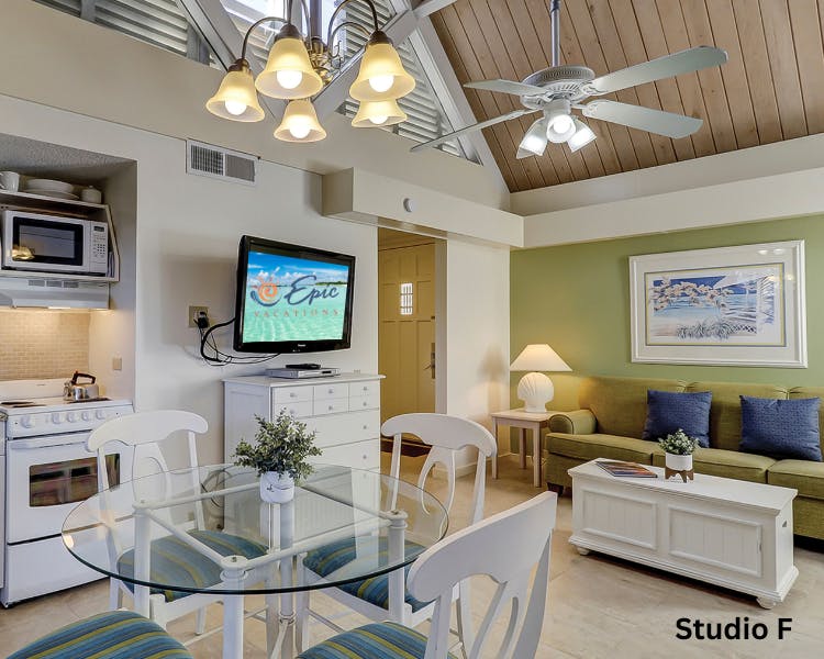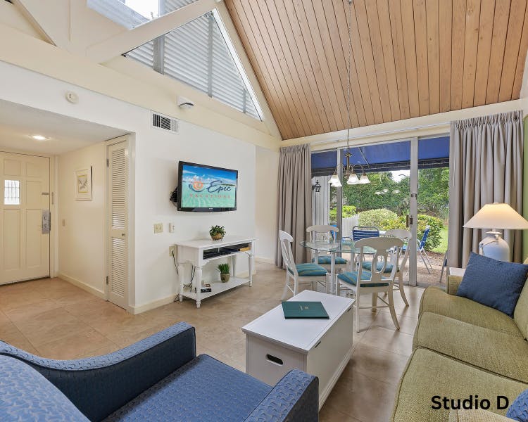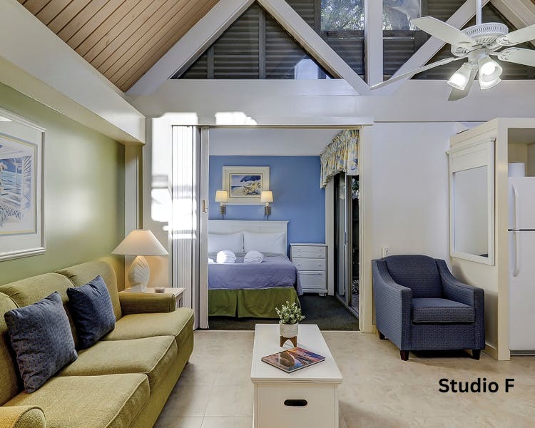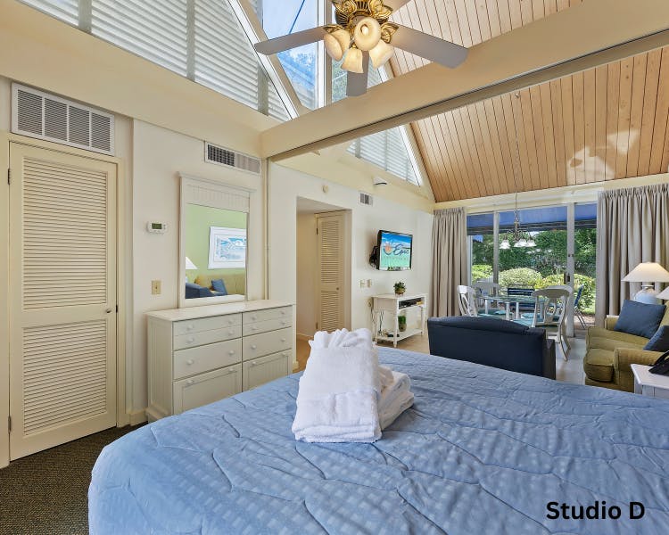 The Village Large Studios at Palmetto Dunes offer the ideal Hilton Head Island vacation rental with all the comforts of home. Enjoy spacious, open plan living with high vaulted ceilings and bright, airy interiors. Just a short, shady walk to the beach and scenic bike paths, these studios are perfect for relaxation. Each unit features a Queen bed, sleeper sofa, fully equipped kitchen and a private patio. Take advantage of amenities like a community pool, playgrounds, waterside BBQ grills and picnic area. Explore nearby golf, tennis, dining and more. Book your stay today! *Large Studio floorplans vary.
