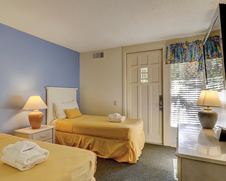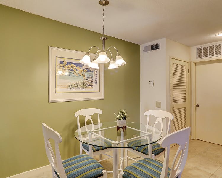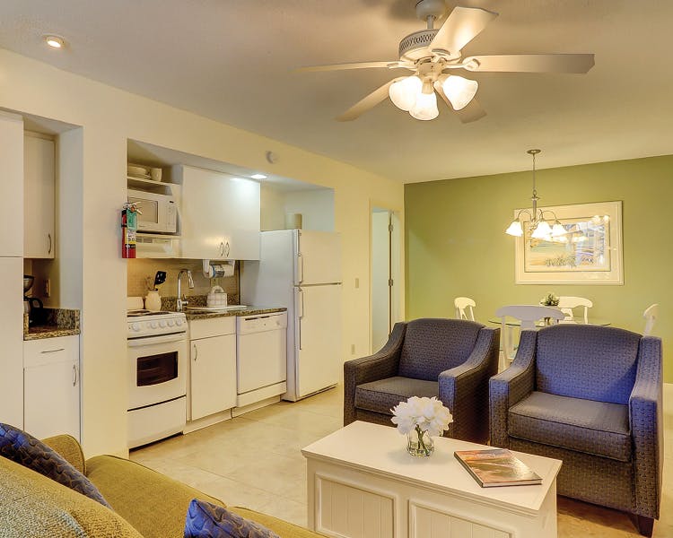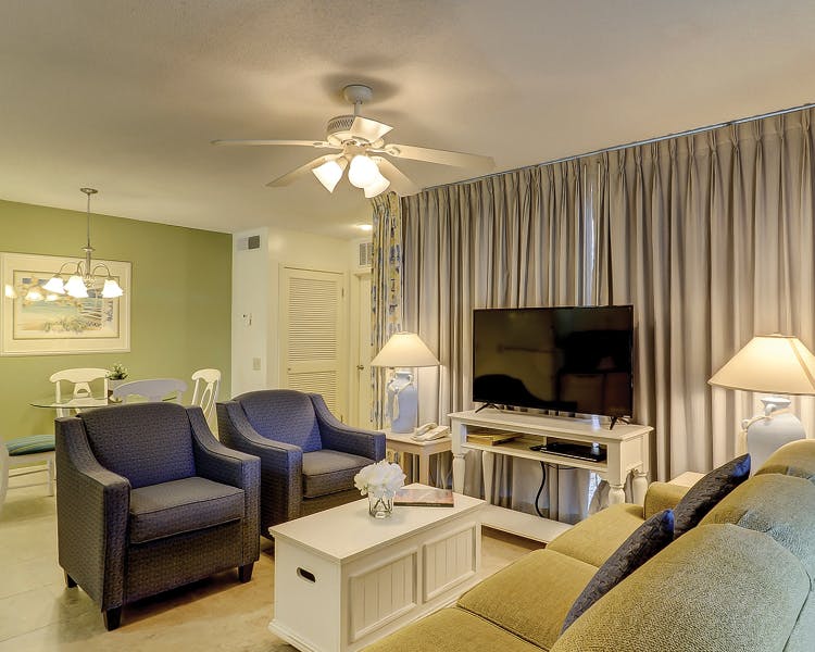 This cozy Village two bedroom, two bath villa rental on Hilton Head Island has everything you need for your next Hilton Head Island stay. This villa features an open space made up of the living room, a dining area, and kitchenette. The living room features a TV, sleeper sofa, and sliding glass doors to a patio. It has two bedrooms, one has a King size bed, Cable TV a private bath, and sliding glass doors out to a private patio, the other bedroom has twin beds. Perfect for anyone looking for comfortable and cozy accommodations while spending the days exploring the resort and Hilton Head Island!