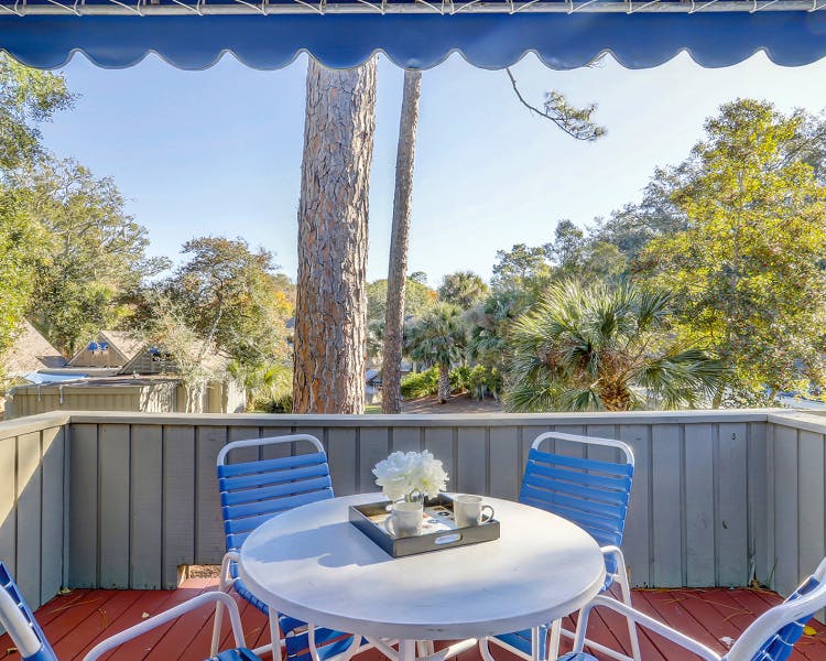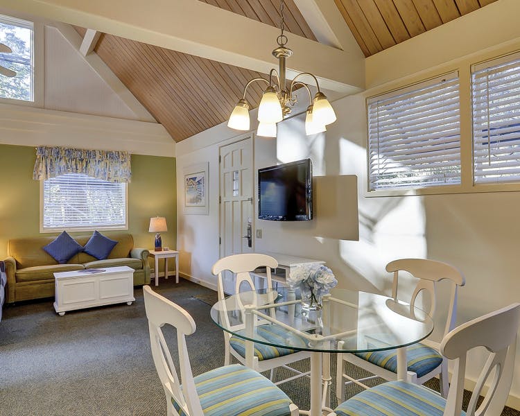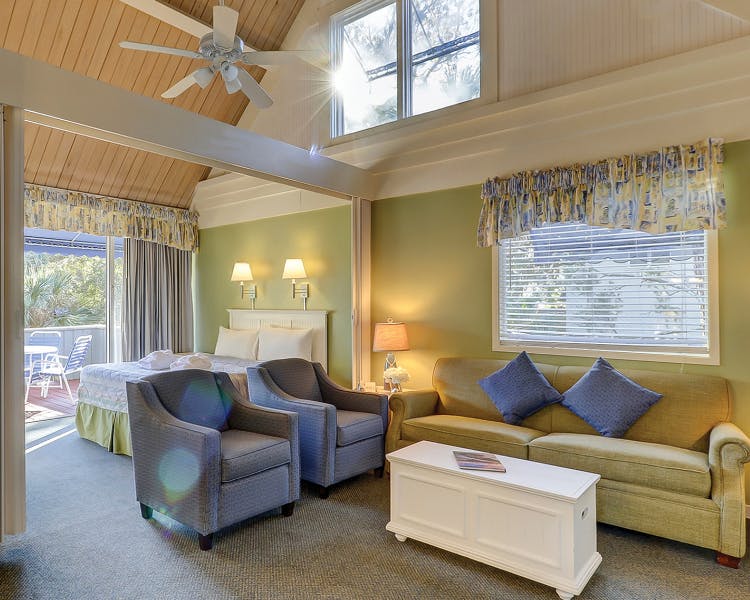 The Village Studio with Lofts are upper level villas, with an open floorplan, high vaulted ceilings, and rafters as you enter the studio. A comfortable living room area with Cable TV and sleeper sofa greet you along with lots of natural light from windows and glass door to the balcony overlooking the premises, lagoon, and natural landscape of Palmetto Dunes Resort. This studio with loft, has a dining area, a galley style fully equipped kitchen, one and half baths, and stairs leading up to the loft which has two twin beds. Start your day with breakfast out on the balcony above and among the beauty of Palmetto Dunes Oceanfront Resort!